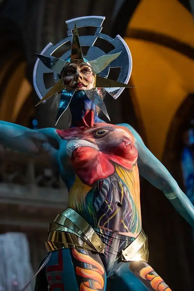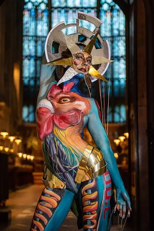 К примеру, на теле одной из моделей можно было увидеть яркого петуха.