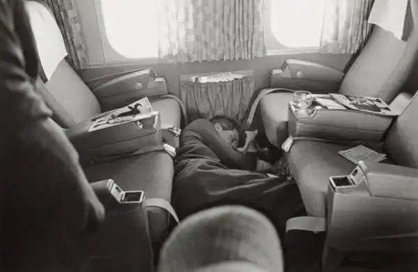 Роберт Ф. Кеннеди спит на полу самолета во время своей президентской кампании 1968 года