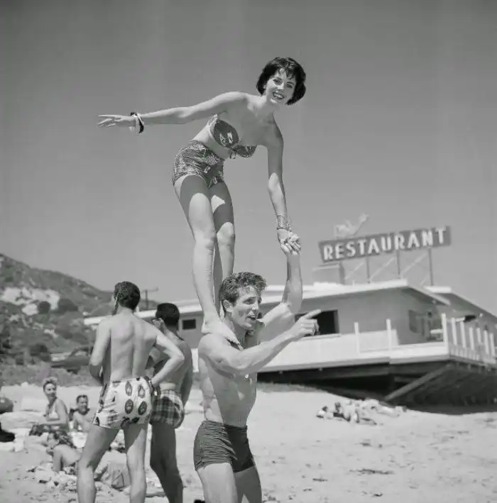 Натали Вуд стоит на плечах Стива Роуланда на пляже Малибу, Калифорния, 15 июля 1956 года. Фото Эрла Лифа
