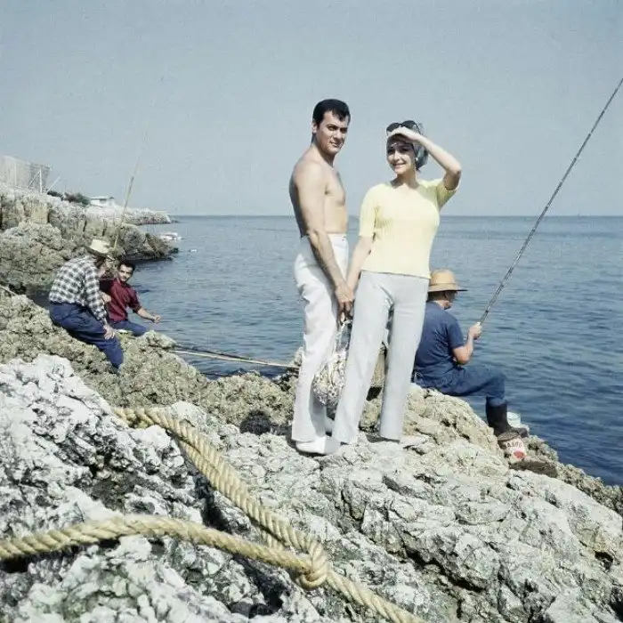 Тони Кертис и Кристина Кауфманн на скалистом берегу Канн, Франция, 1965