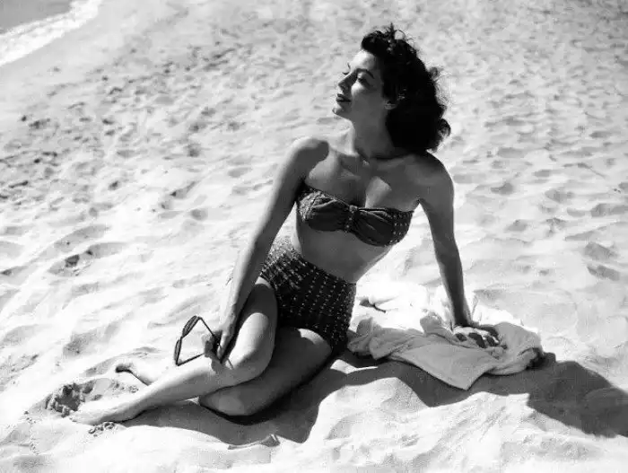 Ава Гарднер позирует на пляже во время съемок фильма "Пандора и Летучий Голландец", 1951