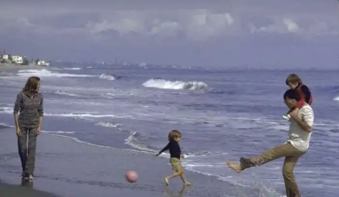 Мэгги Смит и муж Роберт Стивенс играют с сыновьями Тоби и Кристофером на пляже, Малибу, март 1971 года. Фото Майкла Руже