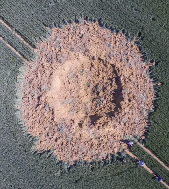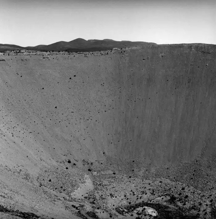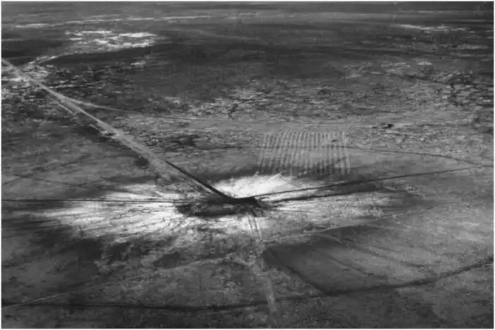 Аэрофотоснимок первого кратера атомной бомбы возле Аламогордо, штат Нью-Мексико, 16 июля 1945 года.