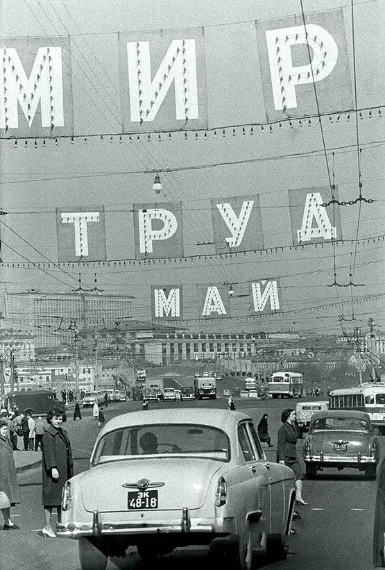 «Мир. Труд. Май », классический майский лозунг в СССР (Москва, 1960-е)