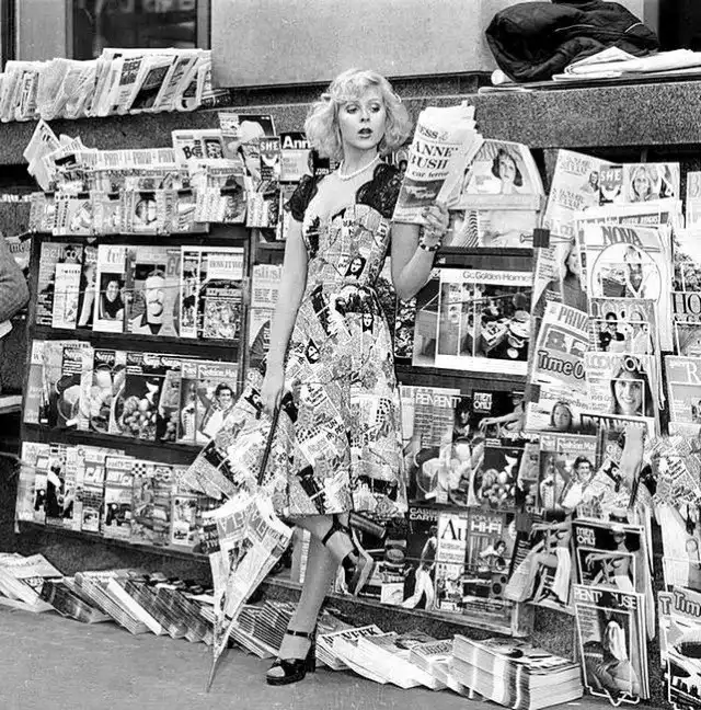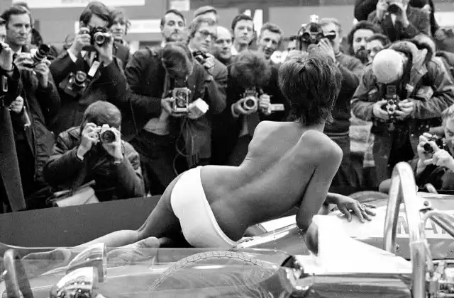 Фотографы вокруг модели, сидящей на гоночном автомобиле в конференц-холле Олимпия, Великобритания, 1971 год
