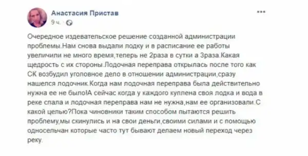 Жители села Филькино в Серовском городском Свердловской области вынуждены самостоятельно возводить мост через реку, так как прошлого не стало еще в 2018 году. Местные власти помогать отказались, ибо сочли это нецелесообразным. Но они придумали решение проблемы. Селянам выделили одну лодку, которая ходит 3 раза в сутки, об этом написала местная жительница Анастасия Пристав.