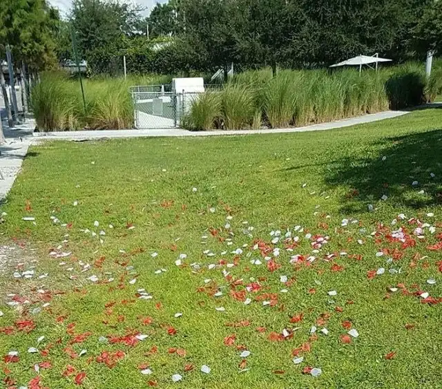 Кто-то праздновал и оставил пластиковые лепестки, которые смоет во время дождя в воду: