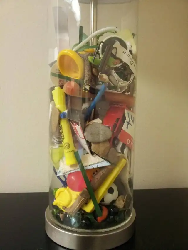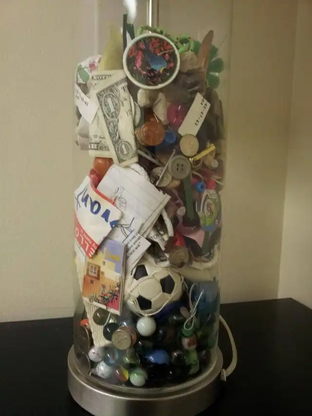 Перед стиркой женщина проверяла карманы своего сына и собирала все эти ценные детские вещички. На протяжении долгих лет она бережно хранила их. И когда настал момент, уложила все это в колбу и сделала интересный светильник, который наполнен воспоминаниями. Идеальный подарок, не так ли?