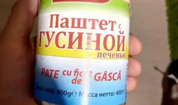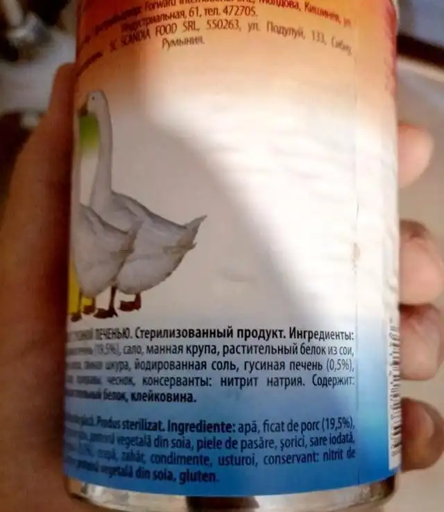 Давайте ознакомимся с содержимым, указанным производителем в составе своего паштета. Итак: свиная печень (смазано слева), сало, крупы, соя, свиная шкура... Вот она, нашлась, гусиная печень – 0,5%. Все по-честному, а теперь посчитаем: в такой банке гусиной печени как минимум 2 грамма.