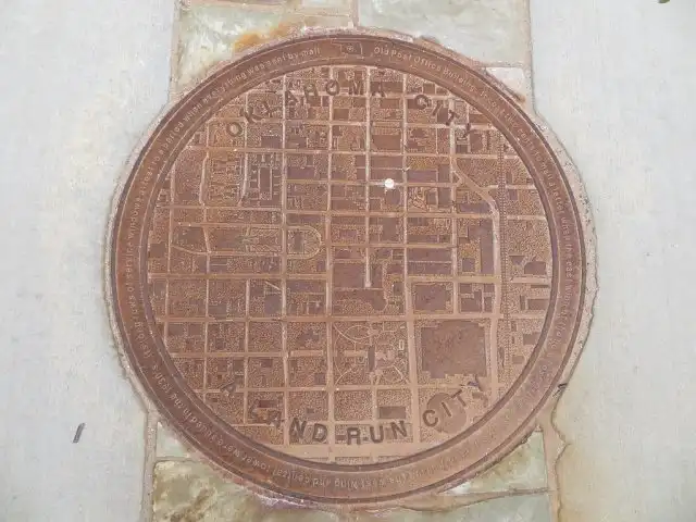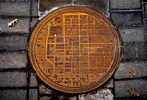 На канализационные люки нанесена карта района, а точка - это ваше местоположение в городе. Очень удобно, если вы турист и немного заблудились.