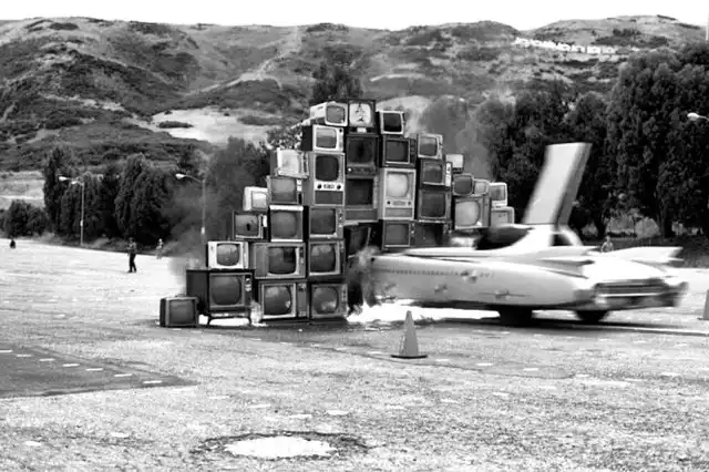 Арт-перформанс, на котором автомобиль на большой скорости врезается в стену из горящих телевизоров, США, 1975 год