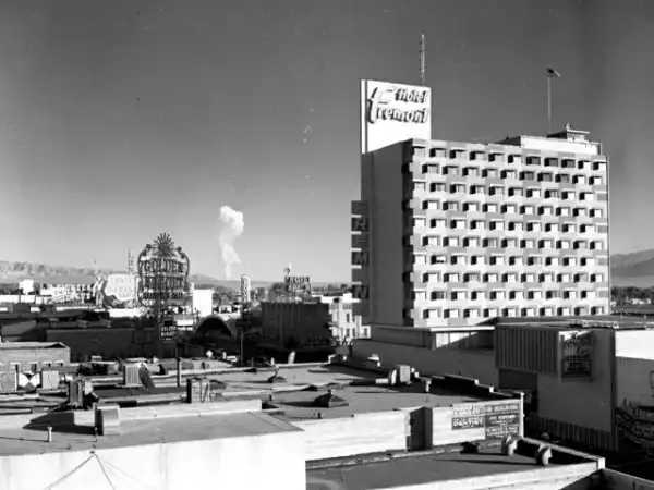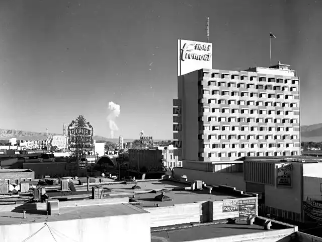 Вид на ядерный взрыв из Лас-Вегаса во время проходивших недалеко в пустыне Невады испытаний, США, 1957 год