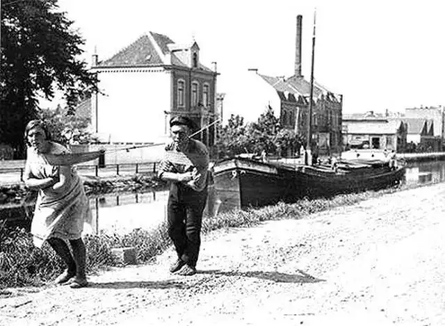 Семейная пара буксирует на себе грузовой катер через канал, Нидерланды, 1931 год