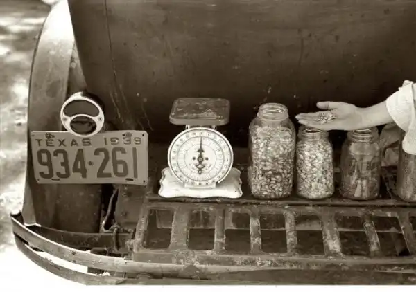 Продажа семян на фермерском рынке в Уэзерфорде, Техас, май 1939 года