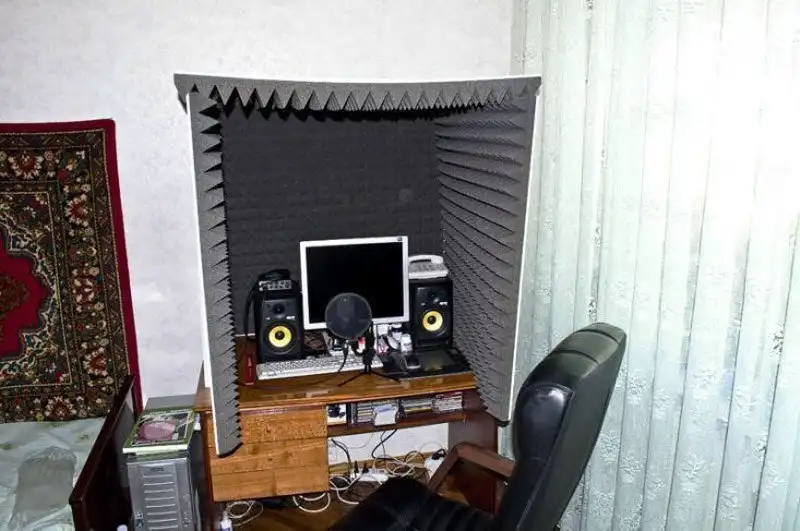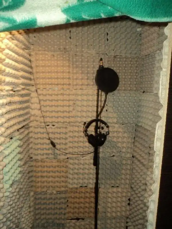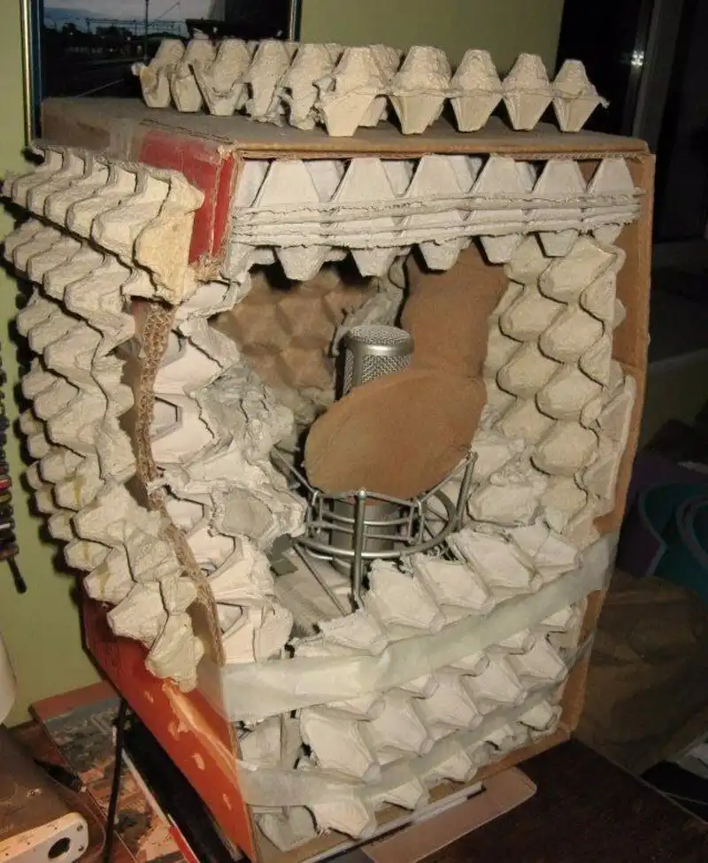 Не всем по карману записываться в студии, поэтому народ пытается сделать это в домашних условиях. Помимо необходимых музыкальных инструментов (микшер, микрофон, миди-клавиатура и т.д), в ход идут поролон, упаковки для яиц и старые одеяла. Некоторые умудряются забацать домашнюю студию в клозете.
