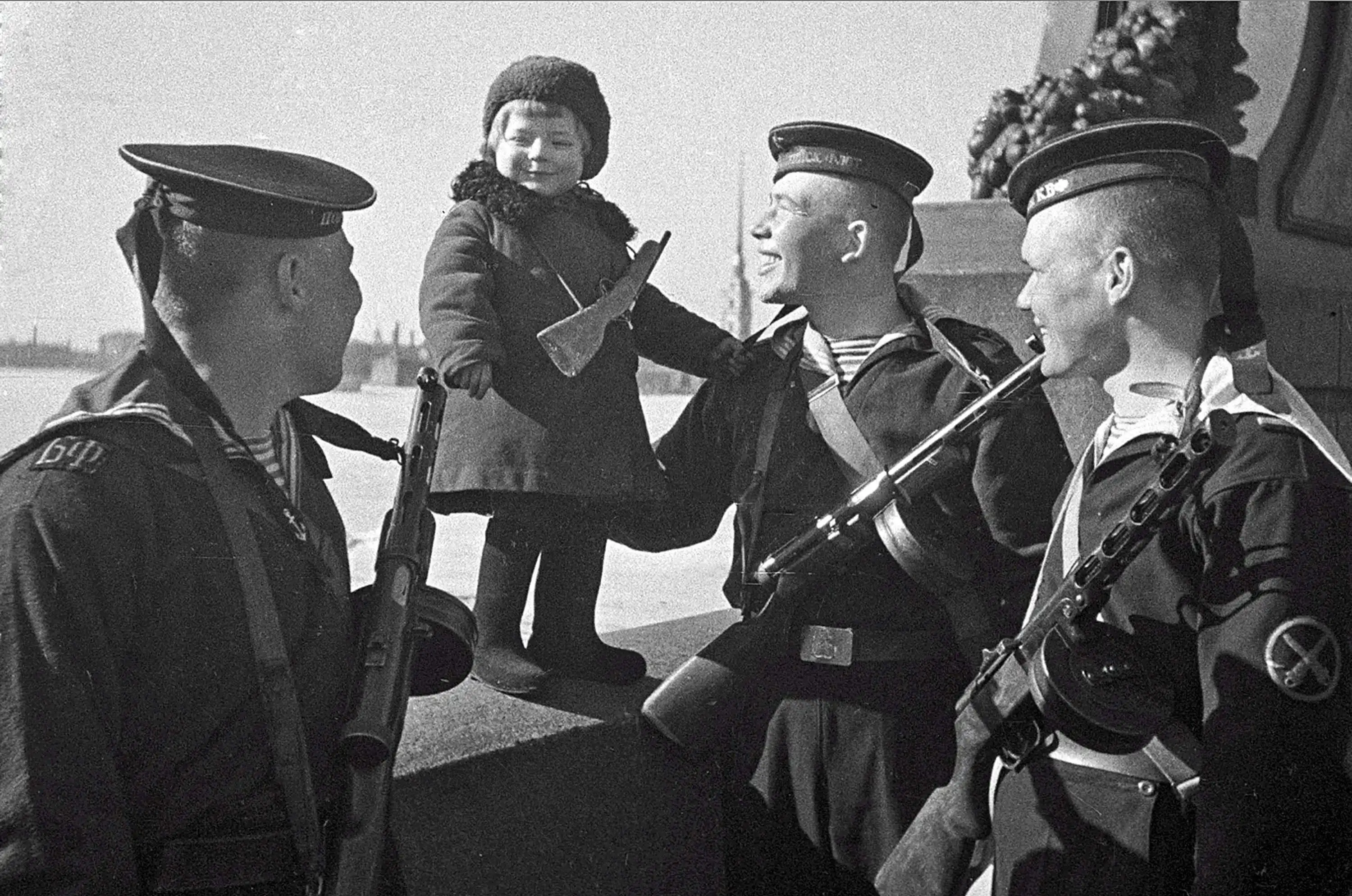 Морские пехотинцы Балтийского флота с девочкой, родители которой погибли в блокаду, 1943 год, Ленинград