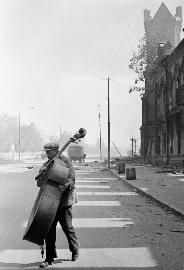 Музыкант симфонического оркестра уходит из разбитого театра, 1942 год, Сталинград