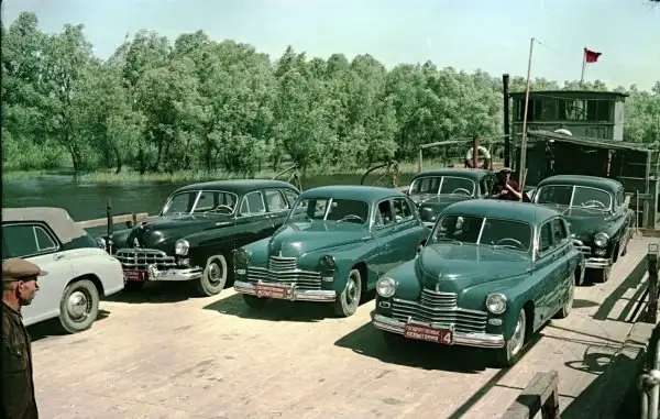 Переправа через реку Кубань в пробеге госиспытаний автомобилей ГАЗ–12 ЗИМ и ГАЗ–М20 «Победа», 1951 год, СССР