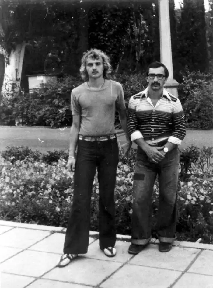 16. Модные ребята на базе отдыха. Там тоже носили самое лучшее. В те времена были очень модны брюки клеш (слева) и советские кроссовки (тоже слева) и нереальной раскраски майки поло (справа).