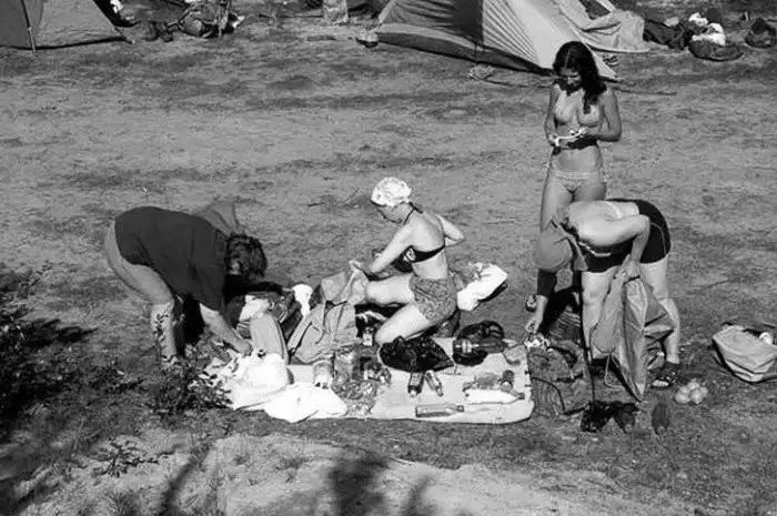 20. Пикник. Эта фотография не такая старая, как предыдущие. Об этом говорит импортный купальник на девушке, которая стоит. В то время как на двух ее подругах типичные труселя (иначе это просто не назовешь) от советских купальников.