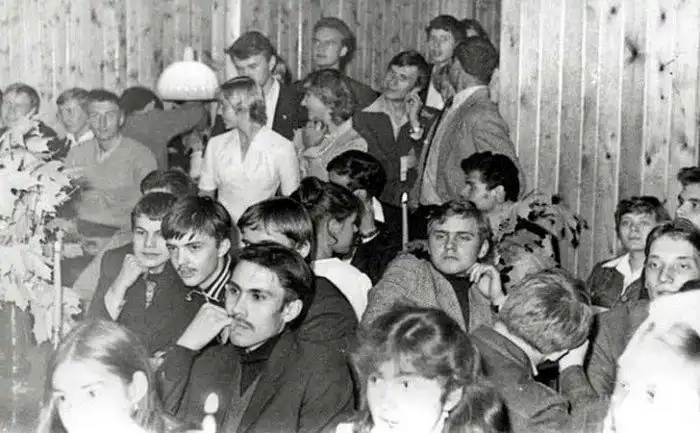 8. Еще одна группа молодых девушек и парней во время какого-то мероприятия. Скорее всего, это просто общий сбор под гитару. Плащ у девушки в центре считался очень модным в те времена.