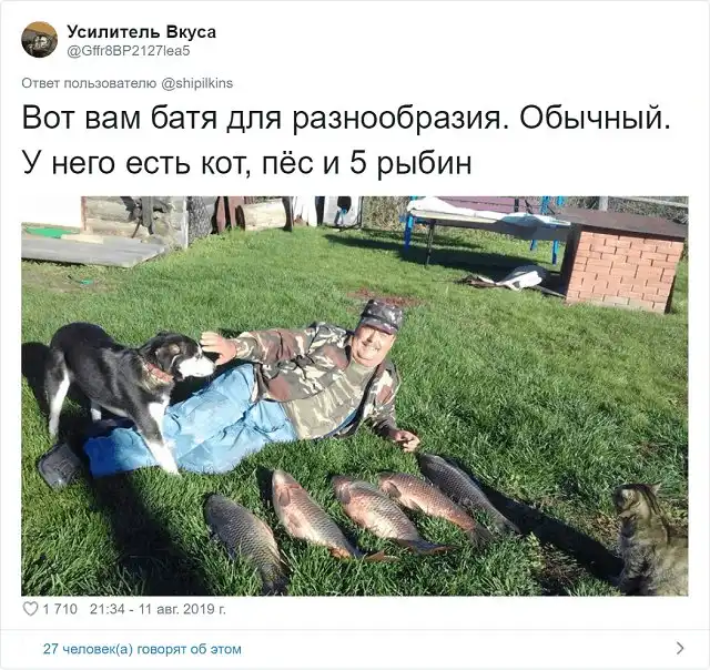 Но в общество прекрасных дам ворвался "Батя" и сорвал больше комплиментов, чем все мамы вместе взятые. Он покорил сердца пользовательниц своей элегантной позой, котиком, собакой и пятеркой рыбин.