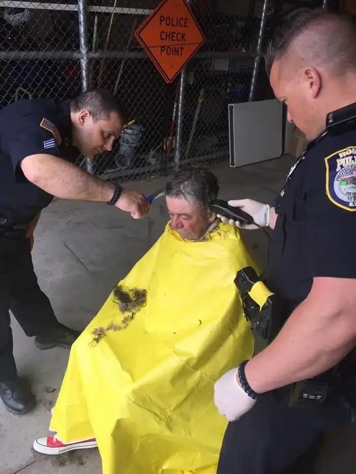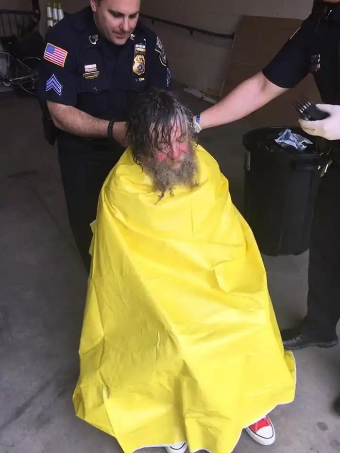 Полицейские разрешили бездомному принять душ, а затем принялись за его внешний вид.