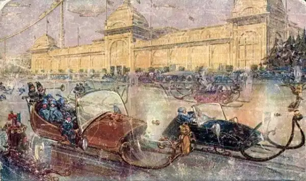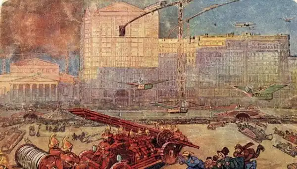 Еще во времени царской России художники задумывались о том, как будет выглядеть Москва в будущем. Они нарисовали серию открыток, на которых изображаются сцены повседневной жизни людей в разных частях города. Особенное внимание художники уделили общественному транспорту. В их представлении о будущем, пассажиров будут перевозить по воздуху. Давайте посмотрим на фантазии художников 1914 года.