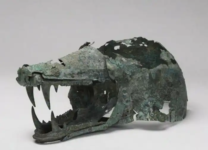 12. Шлем этрусского воина в форме головы волка, VI-V века до н.э., в настоящее время хранится в Гарварде .