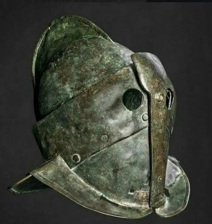 4. Шлем гладиатора-мирмиллона с нащечниками, бронза, Римская империя, 100-300 год н.э. Найден в позапрошлом веке при раскопках Римского Колизея
