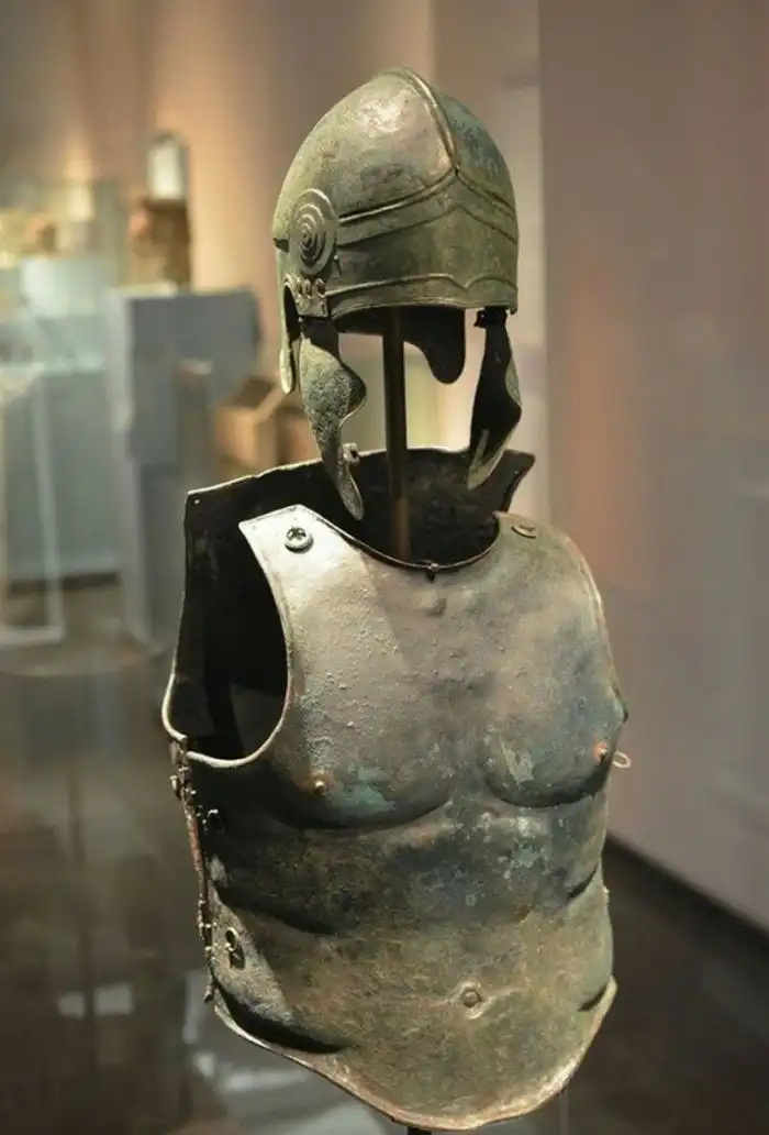 30. Шлем в халкидском стиле и кираса-паноплия греческого воина, бронза, 340-330 гг до н.э.