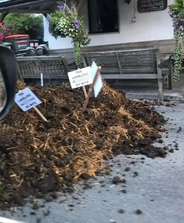 В британской деревне Лисс случился инцидент, который очень рассмешил местных жителей. Правда главному герою данного "инцидента" было совсем не до смеха. Он решил, что его жена супруга изменила ему с женатым владельцем респектабельного паба, Саймоном Эмберли. . Так, ревнивый мужчина, нашел эффектный способ выразить свое негодование по этому поводу. Он буквально "вывалил" свой гнев на всеобщее обозрение. А, если быть точней, то он выгрузил здоровенную кучу навоза возле у паба Саймона. Также он оставил 5 табличек с надписью: "Хозяин тра**** мою жену".
