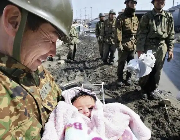 18. Солдат самообороны Японии улыбается, держа на руках ребенка, пережившего разрушительное цунами, 2011 год