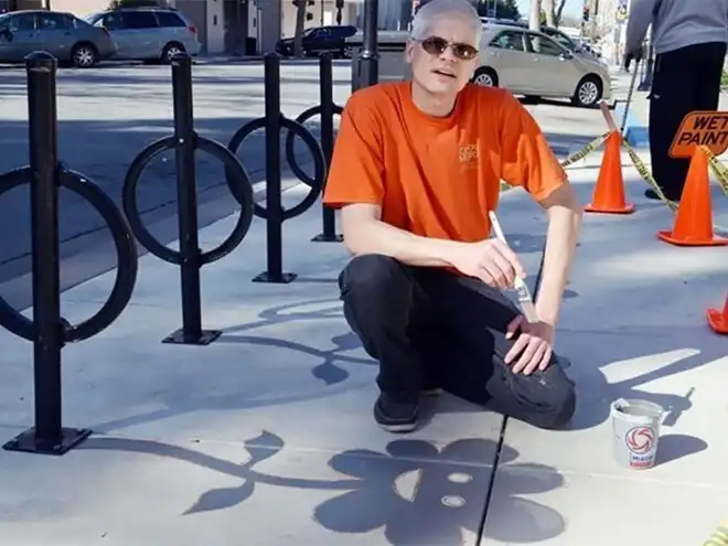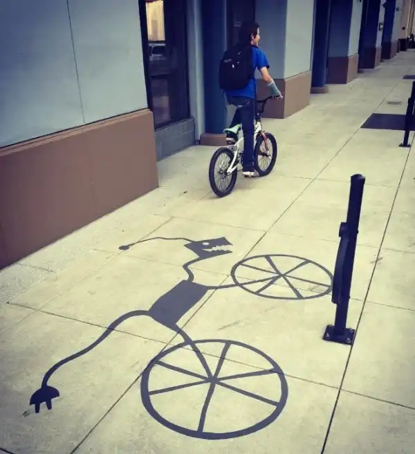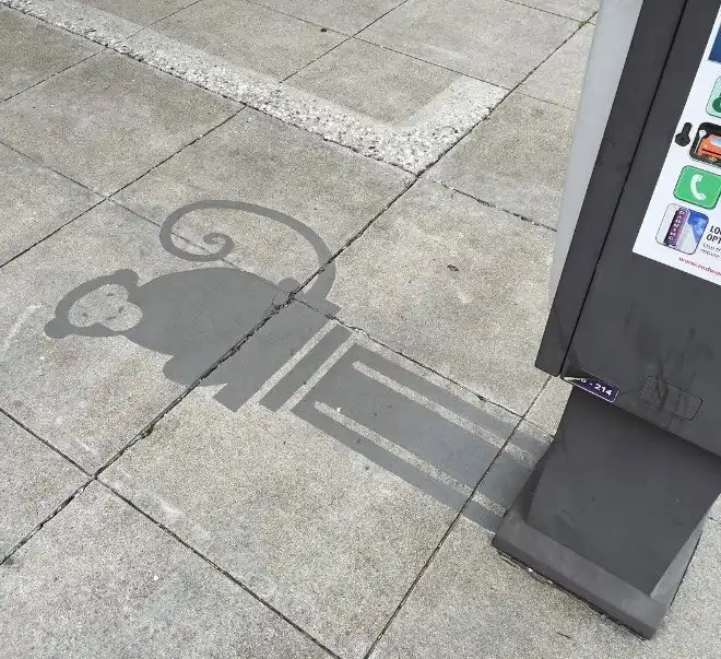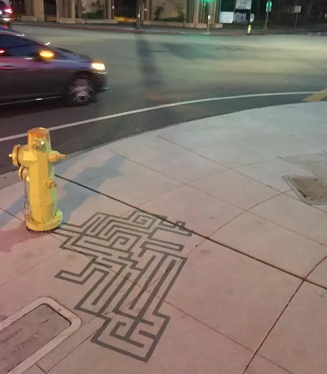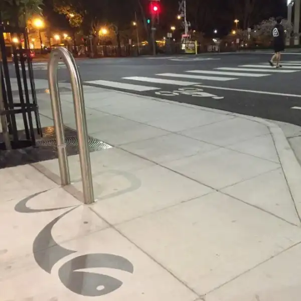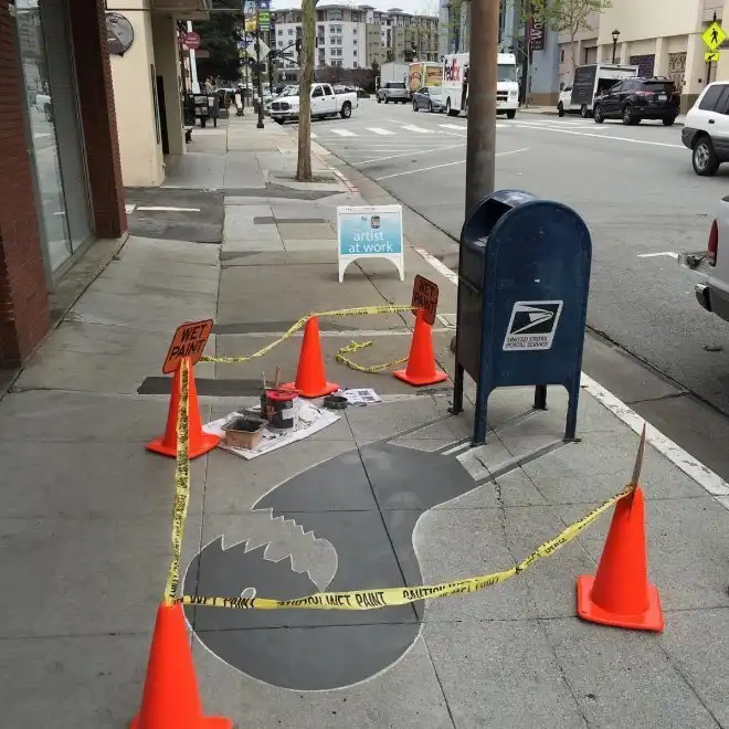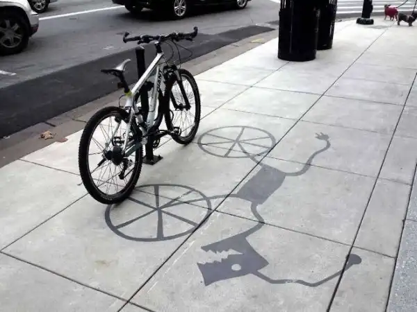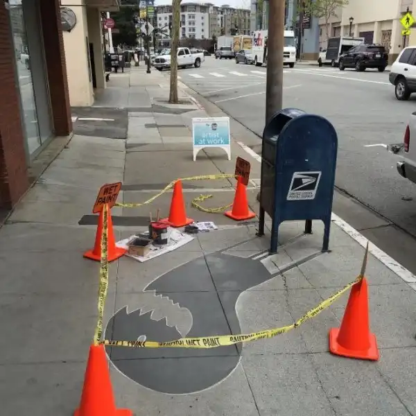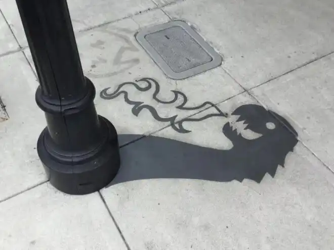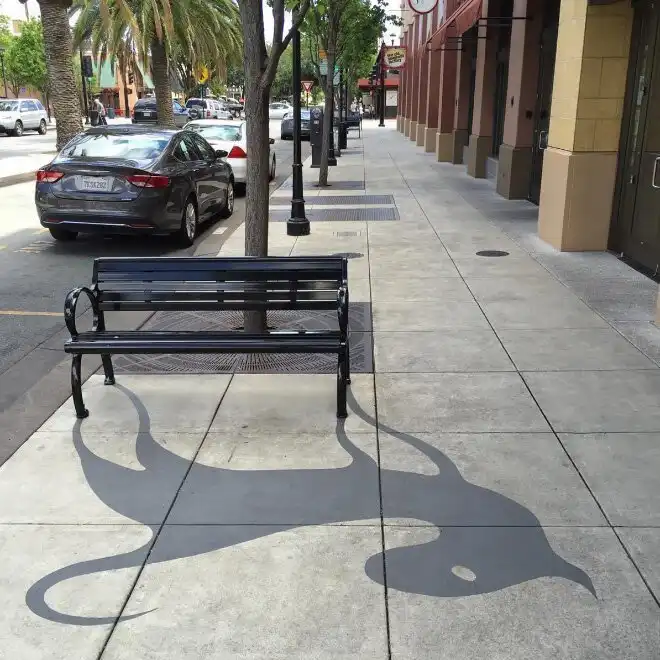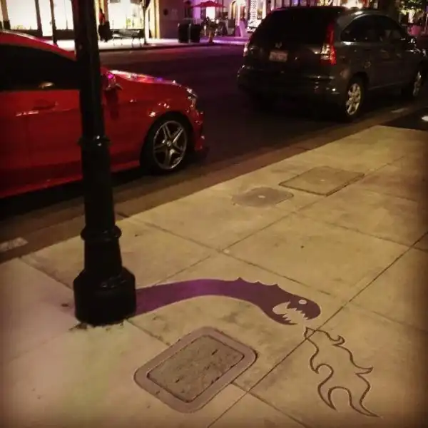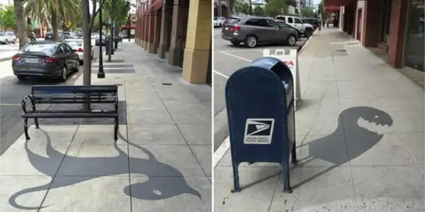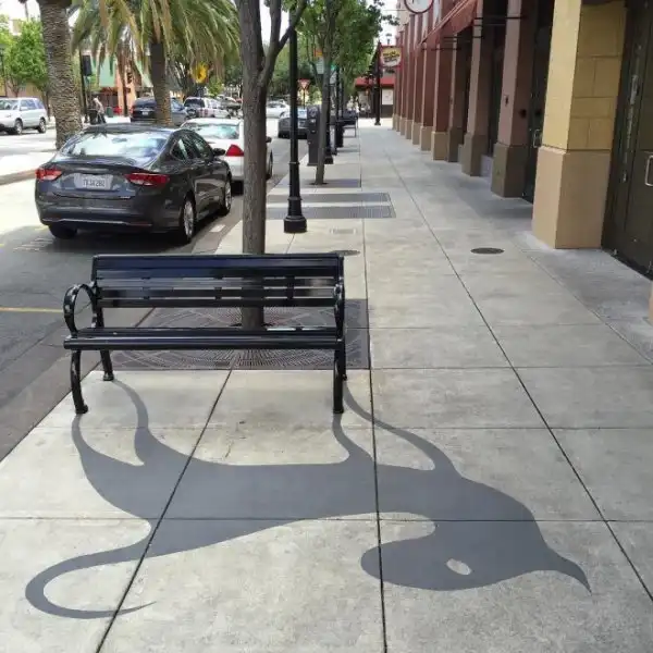Американцу Дэймону Белангеру поручили привнести в городское пространство больше творчества. Художник нарисовал в центре города Редвуд-Сити, штат Калифорния, 20 фальшивых теней. Так, скамейка превратилась в кошку, а фонарный столб - в дракона.