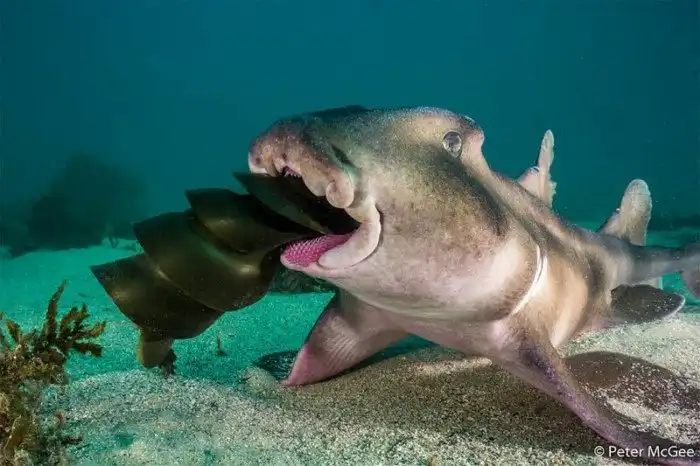 2-е место в категории "Поведение животных": "Злой кузен". Шлемовидная бычья акула поедает яйца австралийской рогатой акулы. Автор: Пит Макги, Новый Южный Уэльс