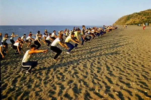 Утренняя гимнастика на берегу моря. В хорошую погоду в 7 часов утра могло собраться и более 200 человек.. Крым, 1983 год