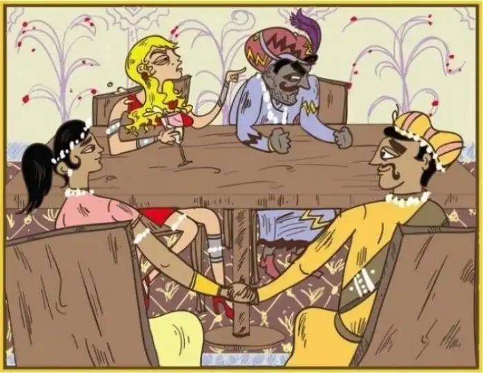 Супруги держатся за руки и демонстративно подчеркивают свою влюбленность в то время, когда другая пара ссорится.