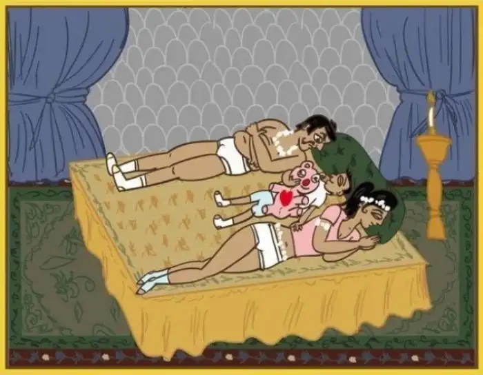 Классическая поза для супругов с детьми. Возникает тогда, когда любовную игру прерывает ребенок, который услышал какой-то страшный звук и решил перебраться спать к родителям.