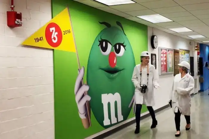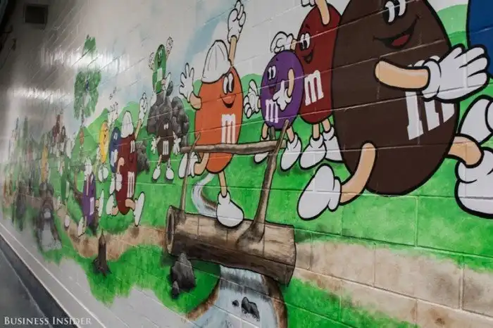 Тур по фабрике начинается с коридора, украшенного яркими рисунками персонажей M&M’s.
