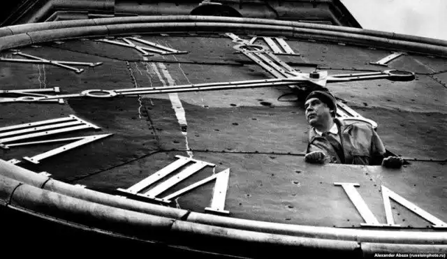 Хранитель курантов Кремля, выглядывающий из Спасской башни.