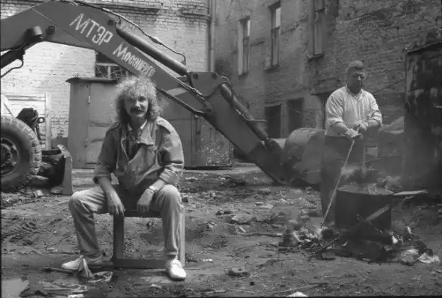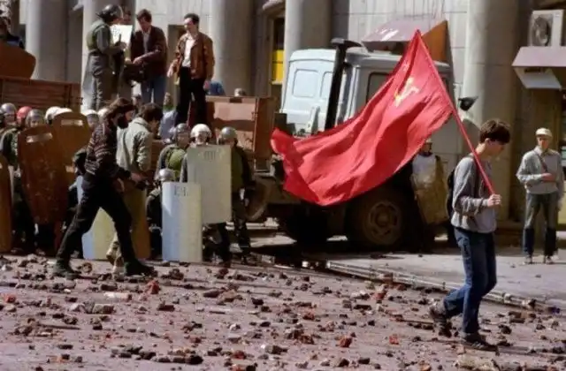 Одинокий демонстрант-коммунист, идущий по усыпанной камнями улице после кровопролитного столкновения с правоохранительными органами, 1993 год