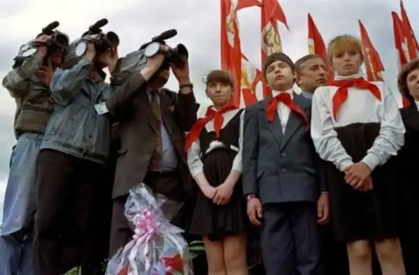 Пионеры во время выступления лидера коммунистов Геннадия Зюганова в центре Красноярка,1996 год