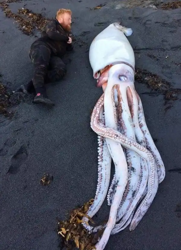 2. Гигантский кальмар, выброшенный на берег пляжа в Новой Зеландии