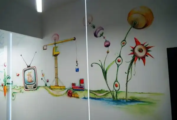 Необходимо было придумать простой дешевый и при этом эффектный способ это всё оформить за 3-4 дня. Вспомнив свой опыт оформления стен карандашом несколько лет назад, я вызвался всё разрисовать восковыми мелками. Как-никак, мелки— чисто детская тема.