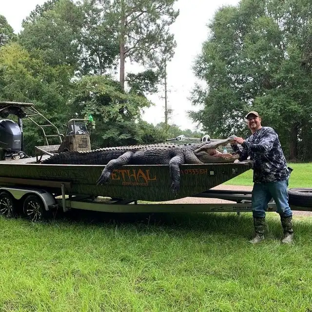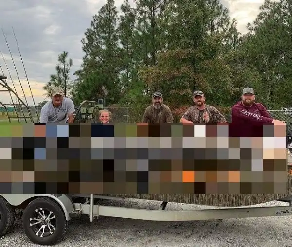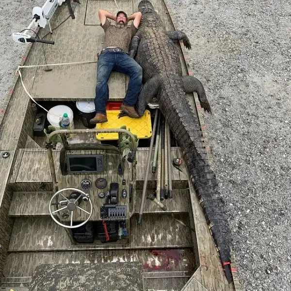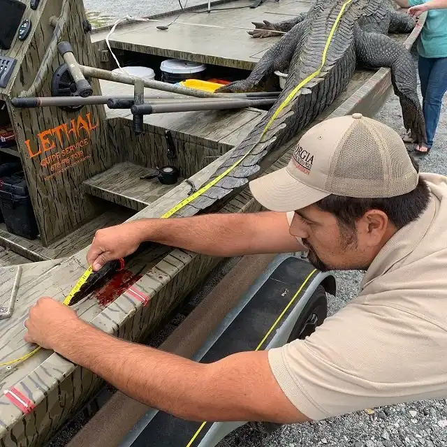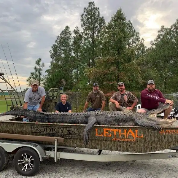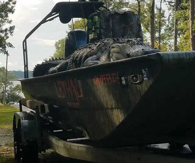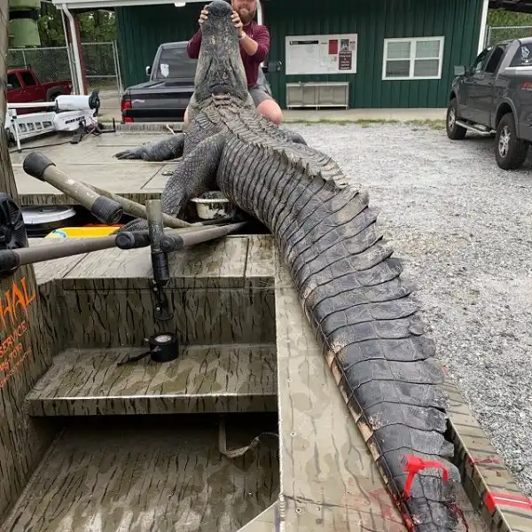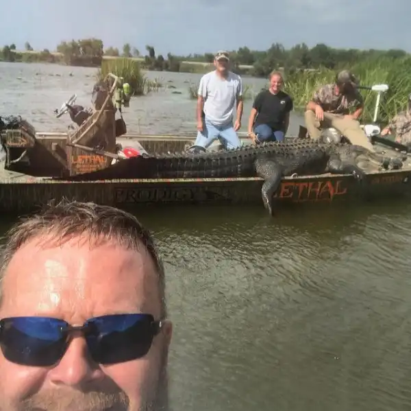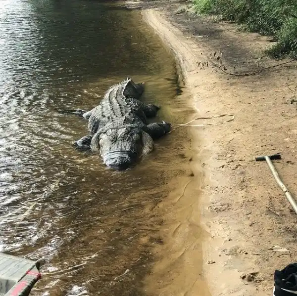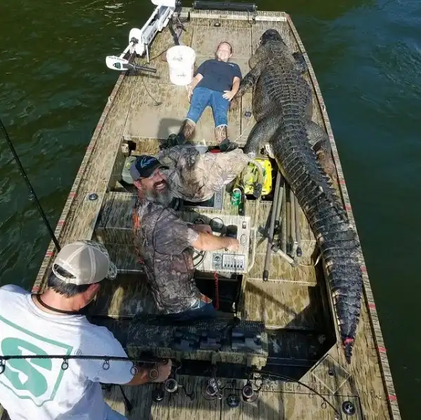 Охотники из Джорджии установили рекорд штата - они поймали настоящего динозавра. Вес огромного аллигатора составлял 317,5 кг, а длина рептилии - (431 см). Охотникам потребовалось 5 часов, прежде чем им удалось достать водяного монстра. Но эти ребята оказались явно не из команды знаменитого австралийского натуралиста и Стива Ирвина. Американские "охотники на крокодилов" убили рептилию и разделали ее на мясо, а из кожи они сделали чучело.