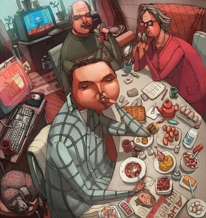 Разглядывать рисунки Сергея Орехова из Красноярска — одно удовольствие! В одном полотне он может уместить огромное количество деталей, которые просты для восприятия, но могут быть не замечены в течение первых нескольких секунд, становясь приятнейшим бонусом.