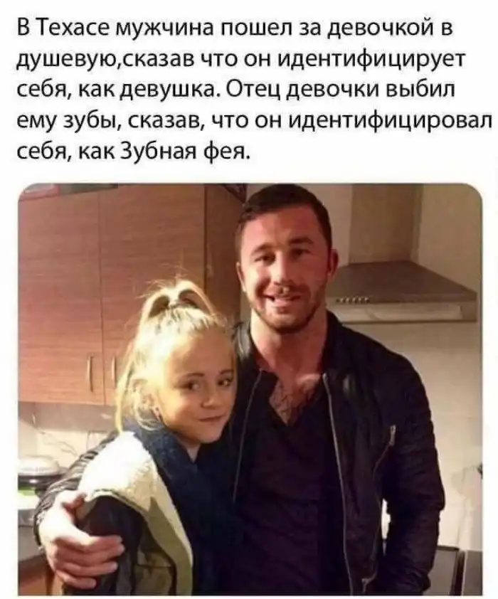На фото просто папа с дочкой, которой он подарил футболку, где написано, что он охраняет свою дочь, но никаких инцидентов с зубами не было