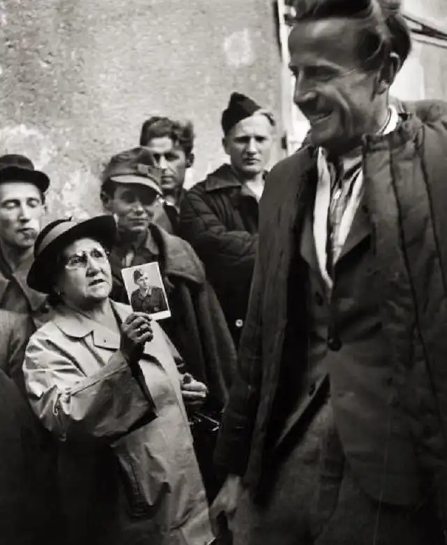 16. Военнопленные возвращаются в Вену после долгого заключения. Мать солдата показывает фото сына в надежде, что кто-нибудь видел его, 1947 год
