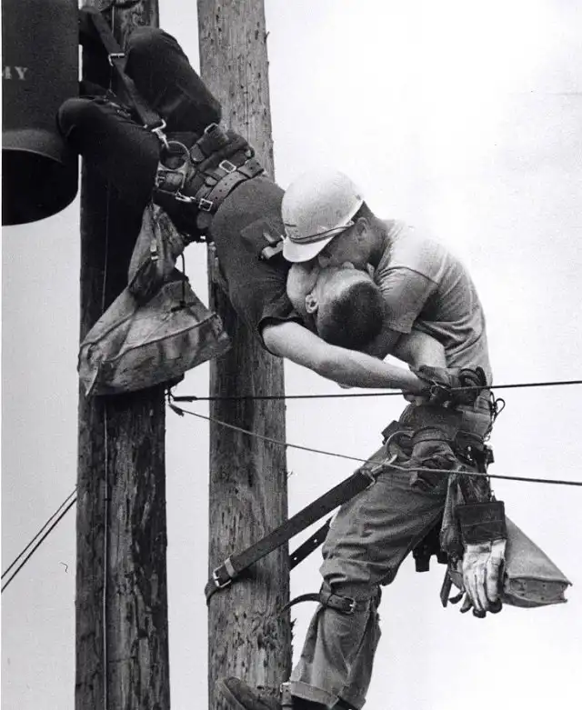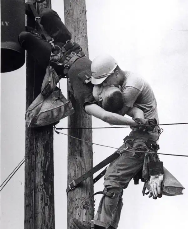 22. Электрик Джей Томпсон делает искусственное дыхание своему коллеге Рэндаллу Чампиону, которого ударило током, 1968 год
