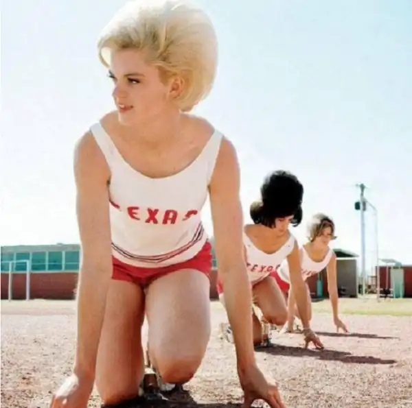 13. Женская команда Техасского технологического университета готовится к соревнованиям по бегу при полном параде, 1964 год